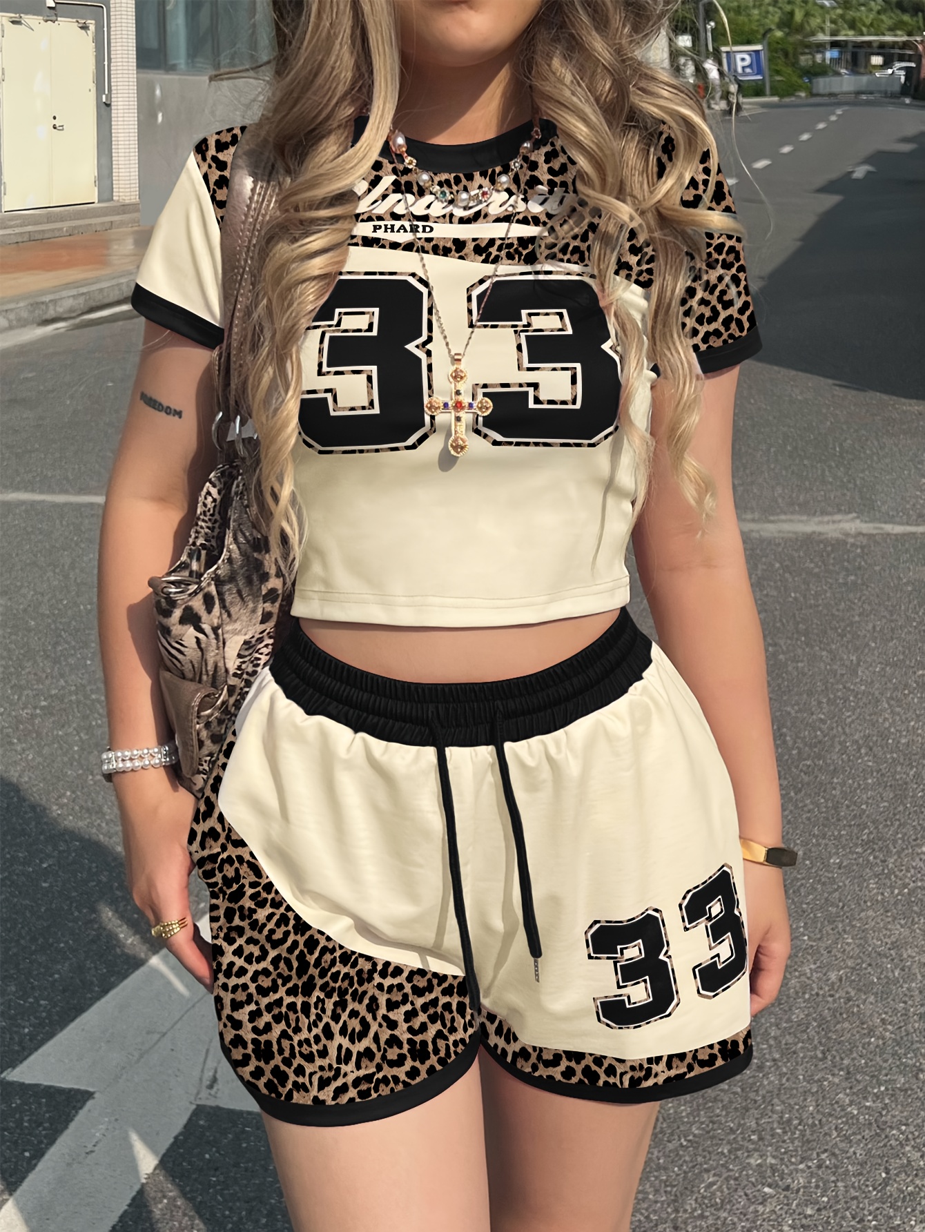 [2pcs Trendy Leopard Set] 2pcs Trendy Summer Leopard Print Short Sleeve + Shorts Set for Women | High-Waist Drawstring Pants and Digital Print, Versatile Outfit