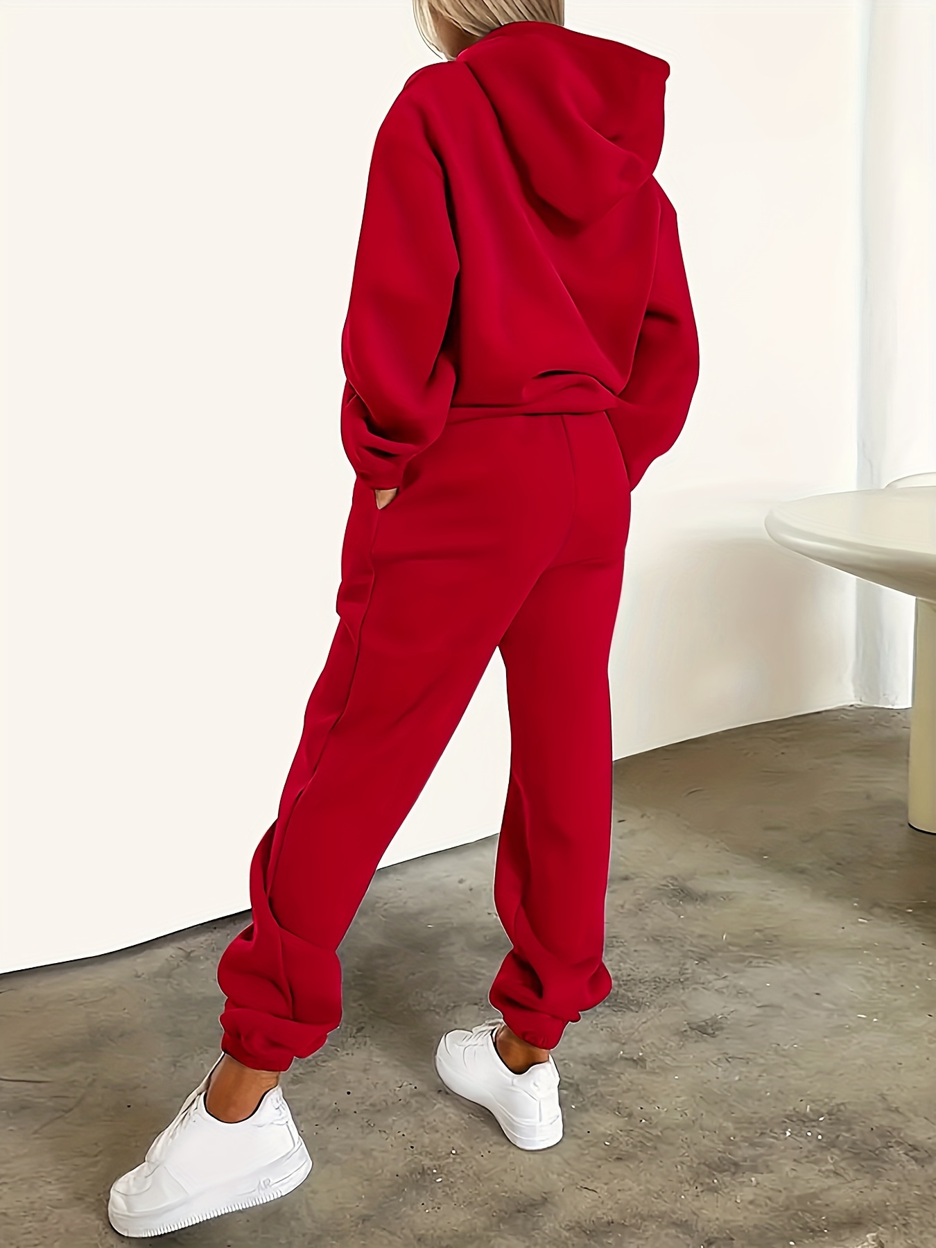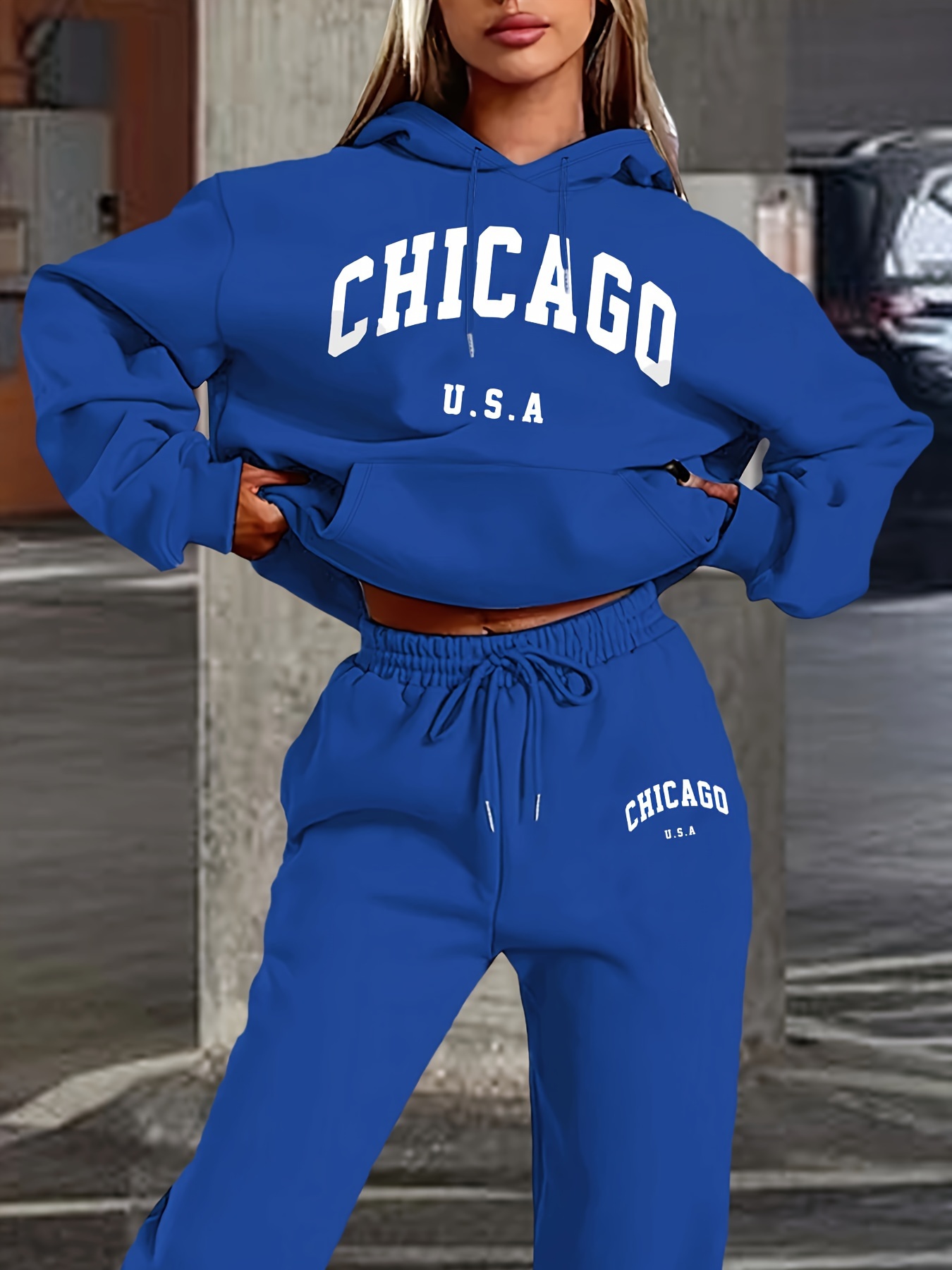 [Chicago U.S.A. Print Hoodie Set] Red Polyester Women's Chicago U.S.A. Letter Print Hoodie & Pants Set - Drawstring, Machine Washable Casual Outfit
