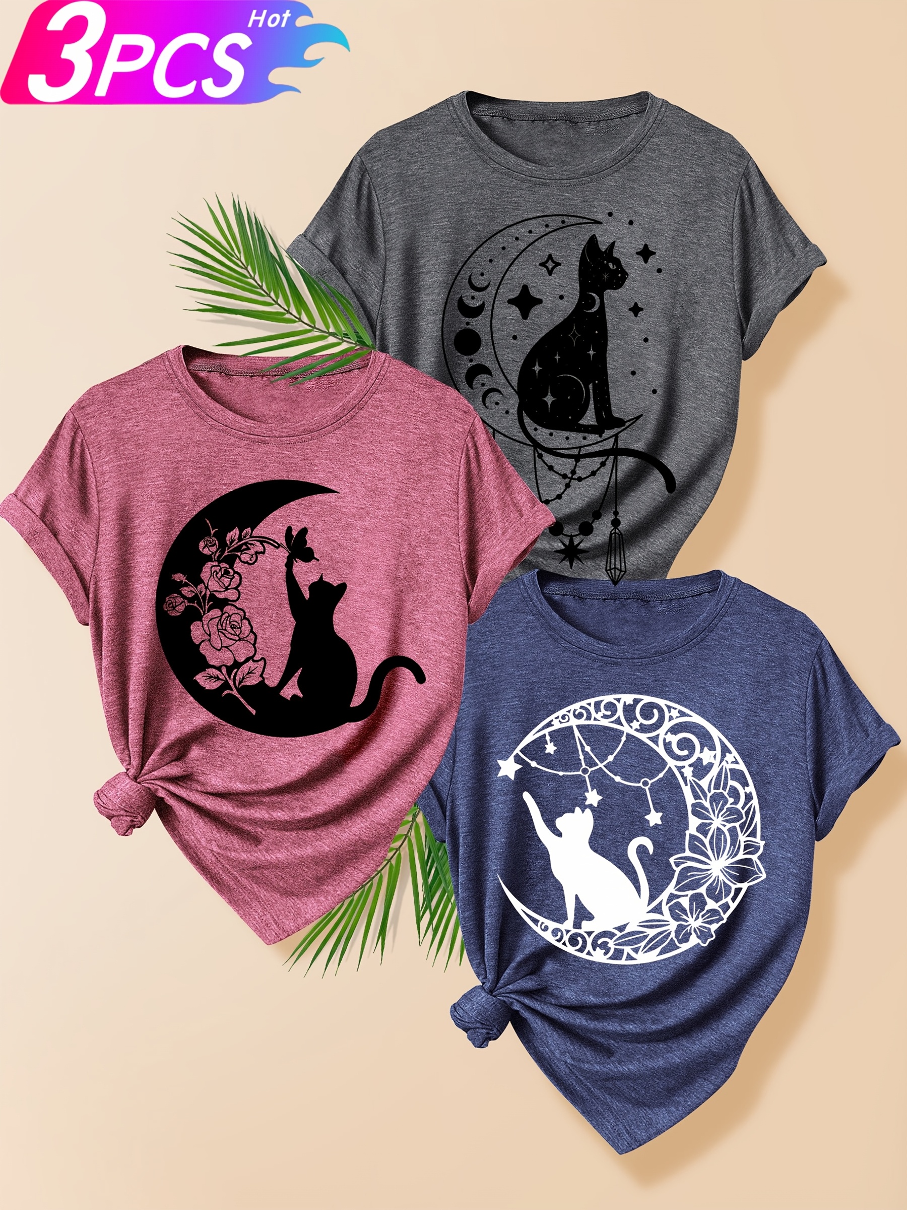 Creative Moon Cat Pattern Three-Piece Set: Family, Friends, Sisters - Printed Fashion Retro Style Women's Summer Casual Sporty Round Neck Short Sleeve T-Shirt in Multiple Colors