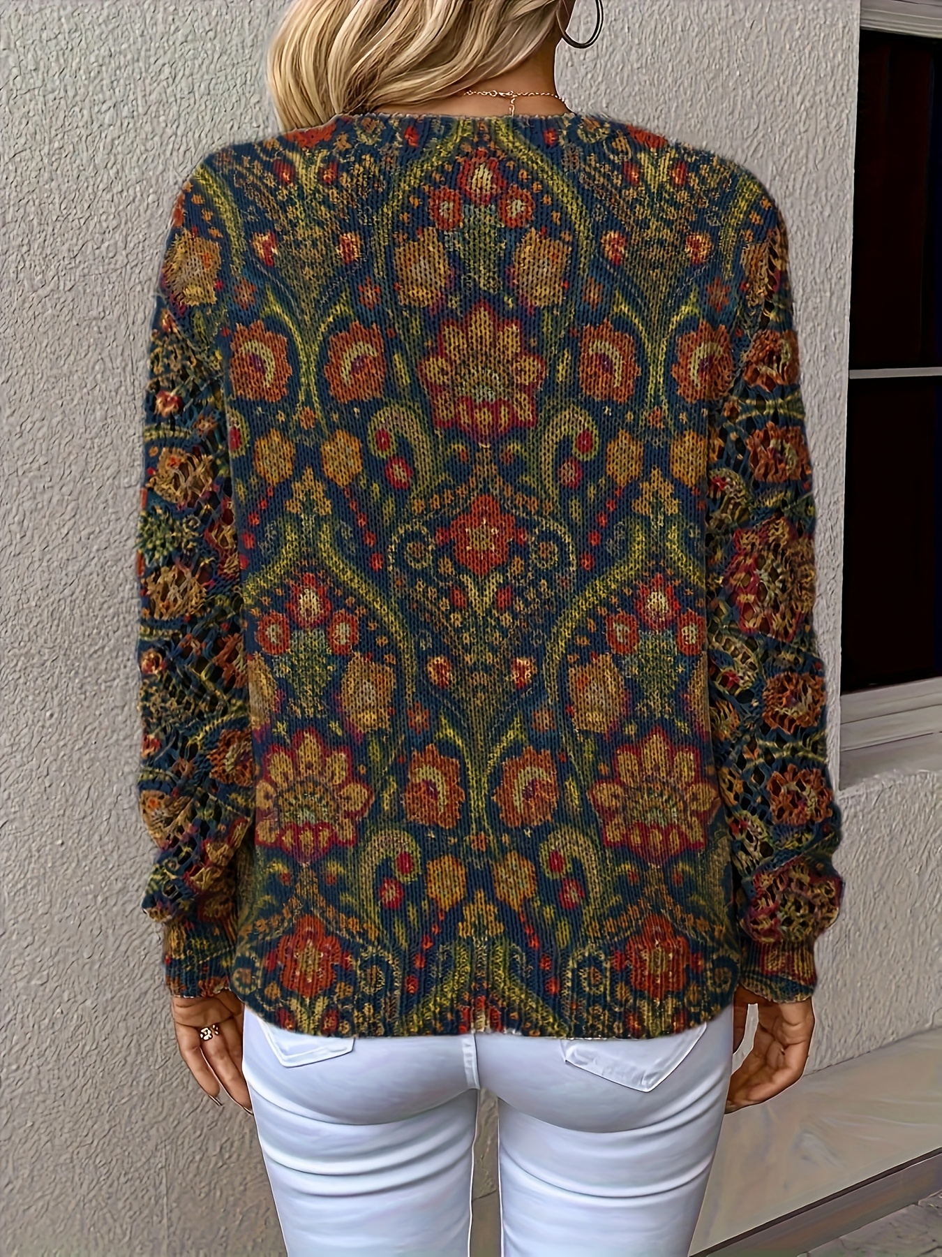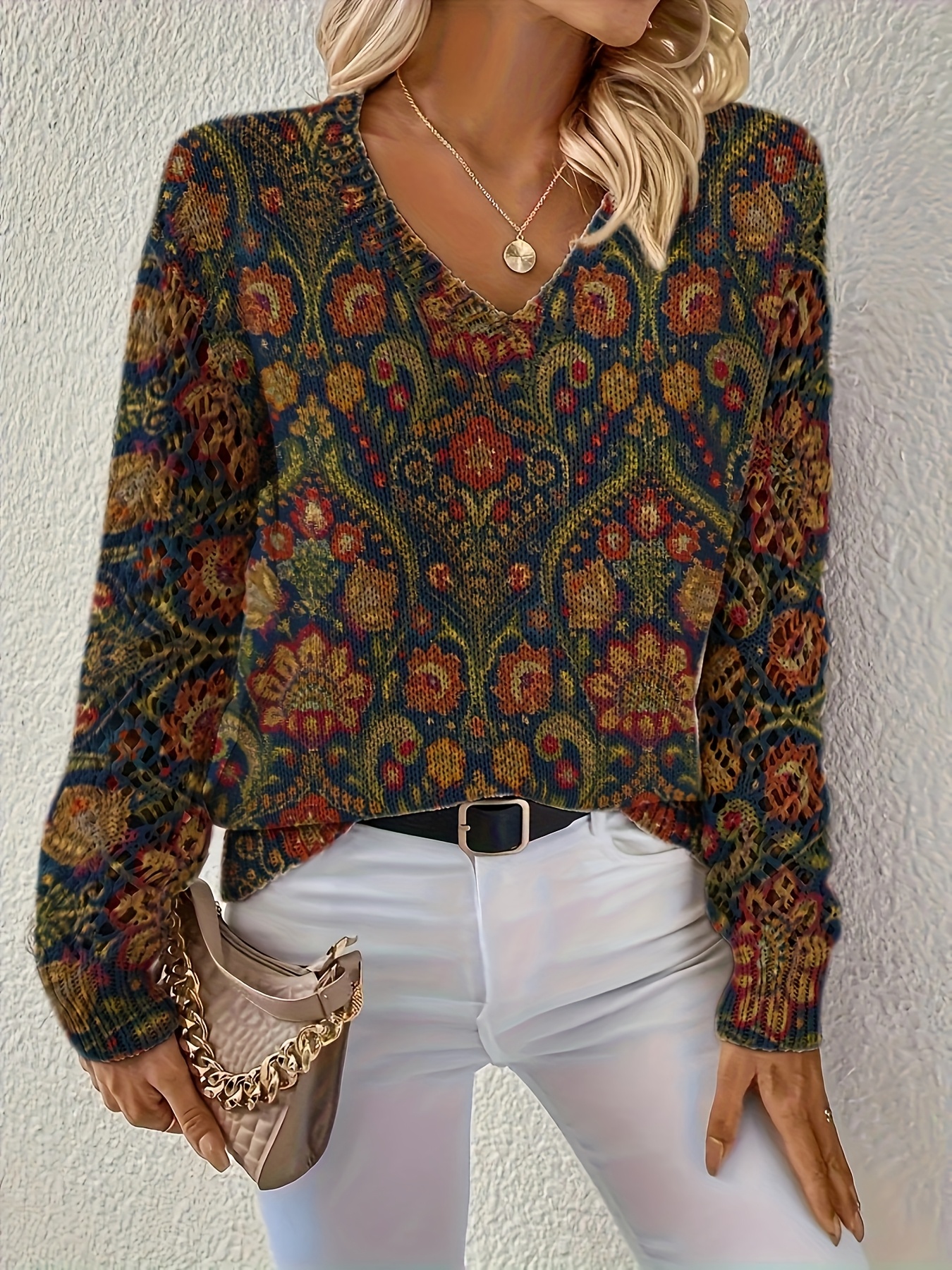 [Elegant Bohemian Sweater] Elegant Bohemian Women's V-Neck Long Sleeve Sweater | All-Season Floral Digital Print Pullover for Office, Streetwear & Home - Versatile Casual Chic Top