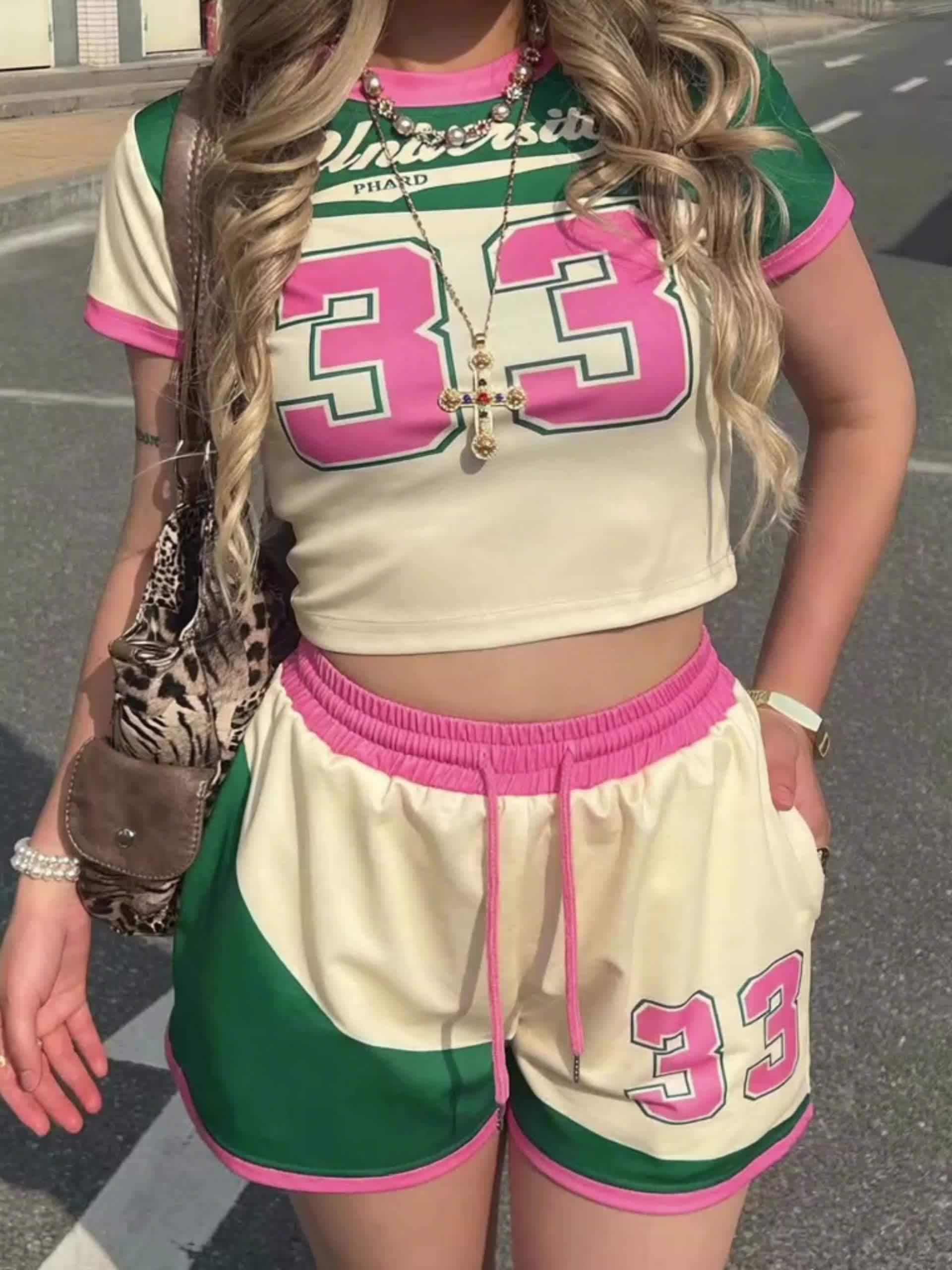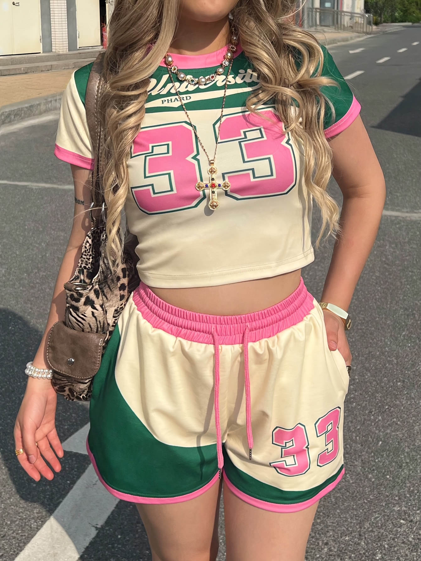 Fashion University Style Short Sleeve Top and Shorts Set, Summer Casual Wear, Floral Print, Letter 33 Design, Perfect for Outdoor and Daily Wear
