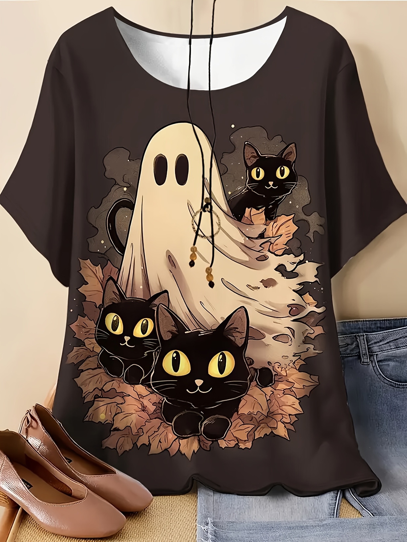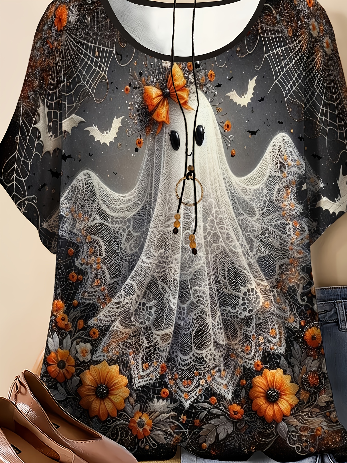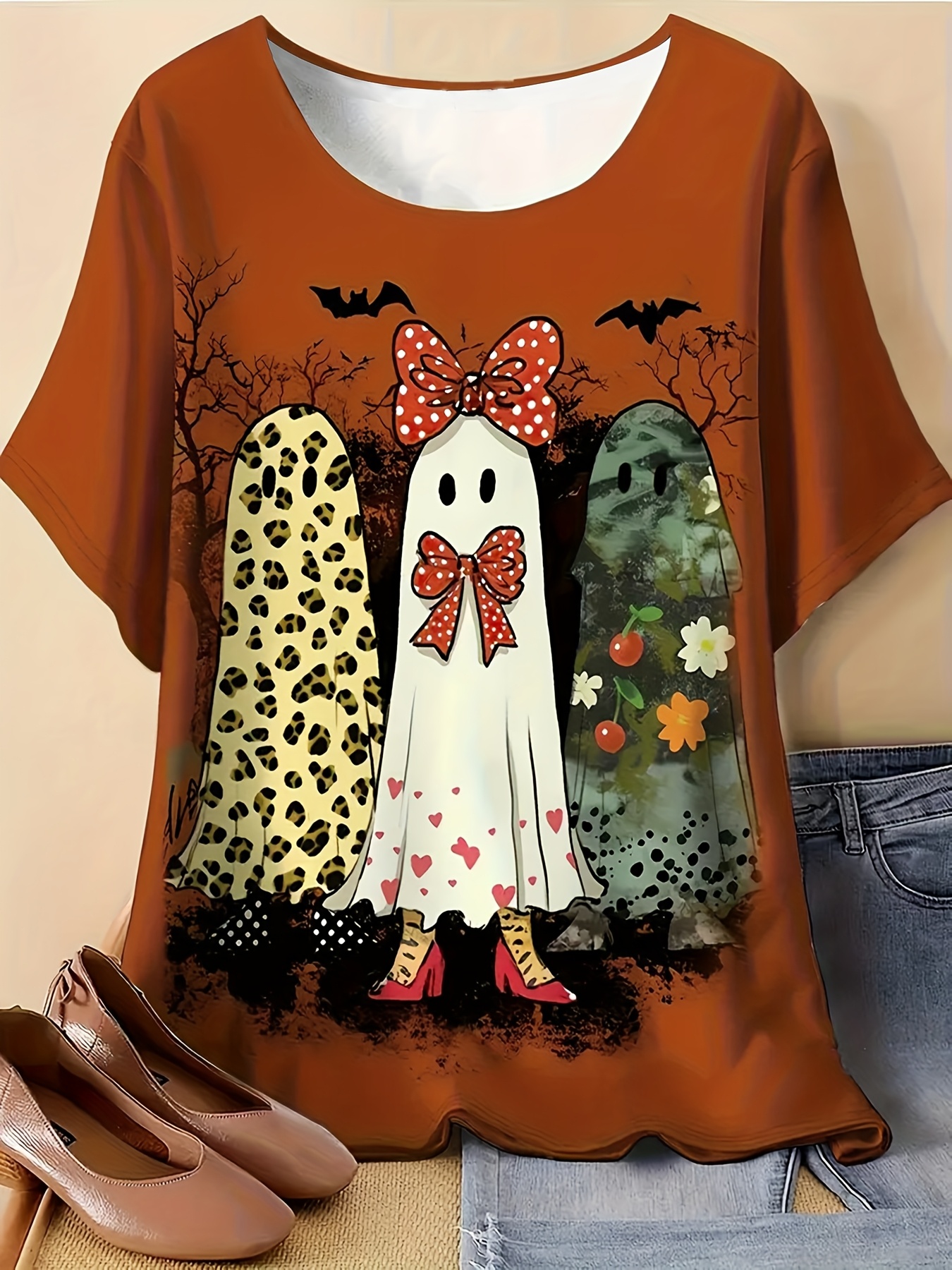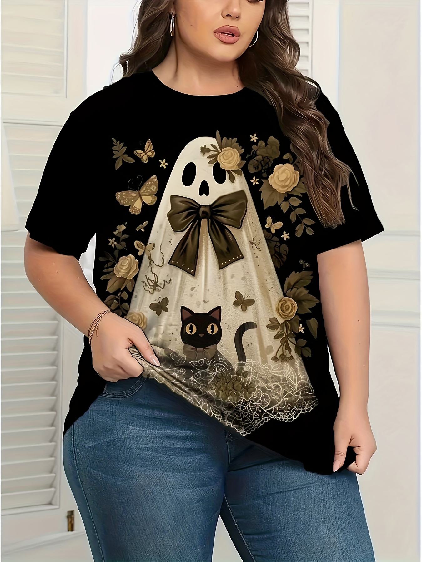 Plus Size - Plus Size - Women'S Plus Size Halloween T-Shirt - Cute Ghost & Pumpkin Print, Casual Crew Neck Short Sleeve Top, Medium Stretch, Non-Transparent, Machine Washable, Festive Summer Fashion, Halloween Apparel | Playful Print Top | Stretchy Fabric
