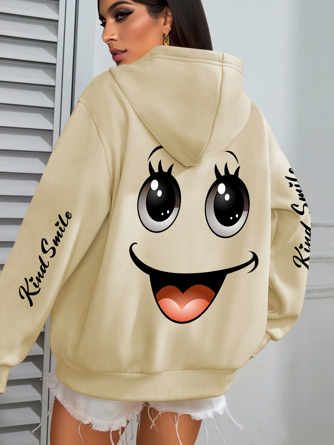 Plus Size smiling face Print Hoodie, Casual Fashion Sweatshirt, Hooded Pocket Drawstring Sweatshirt for Fall & Winter, Women's Clothing