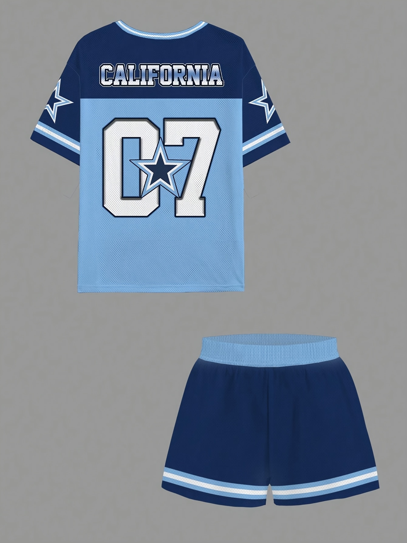[Women's Blue Shorts Set] 2pcs Women's Blue y Shorts Set with Breathable Mesh Design, Loose Fit American Digital Print for a Look, Perfect for Summer