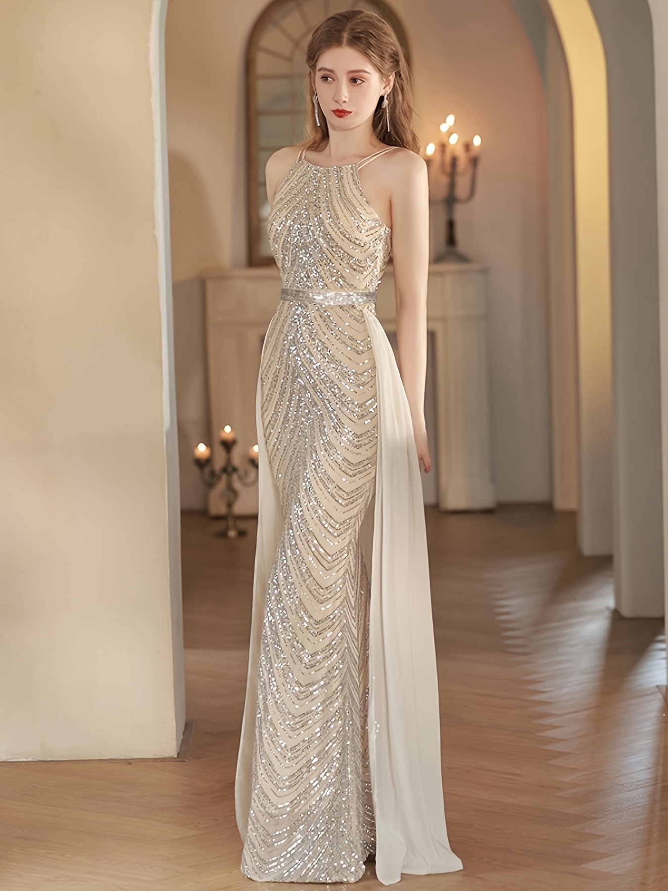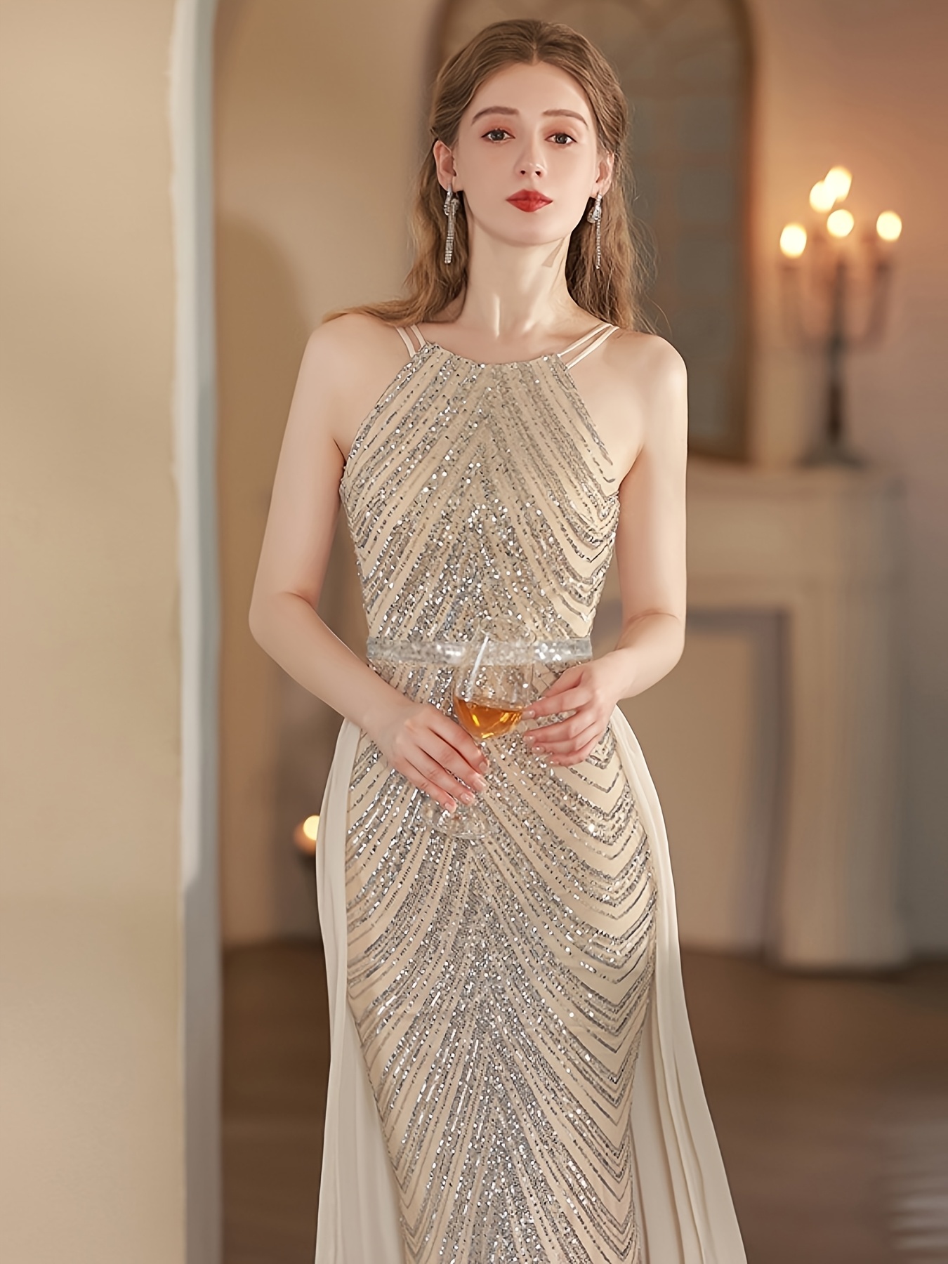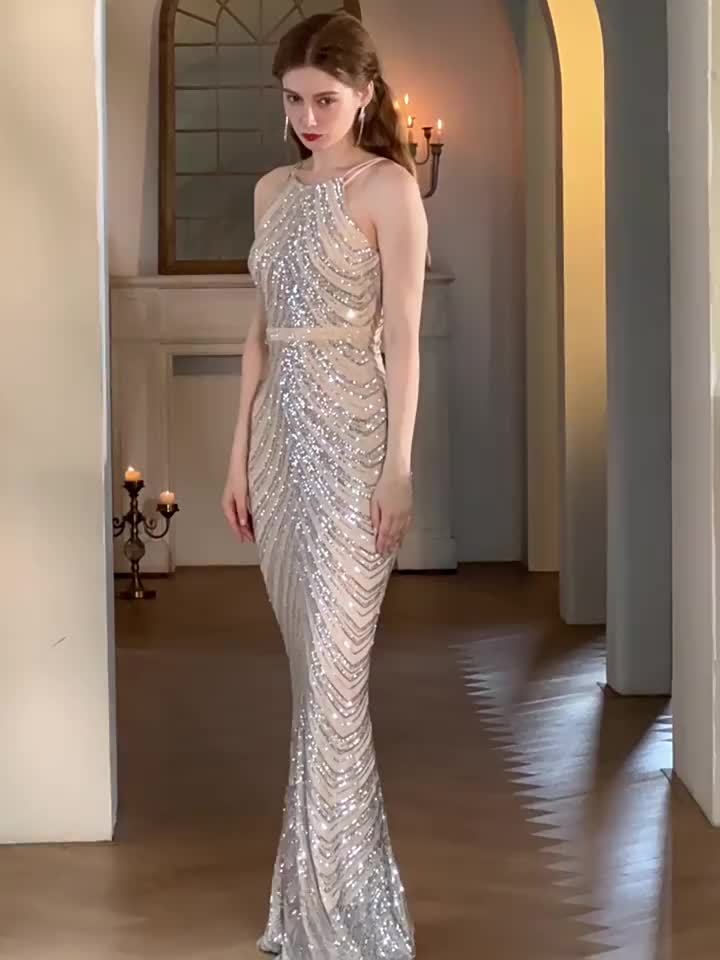 Women's Elegant Champagne Evening Gown - Formal Party Wedding Dress with Sequin Skirt, Mermaid-like Fishtail Train, for Prom, Galas, Hosting Events - Luxury Glamour Dress