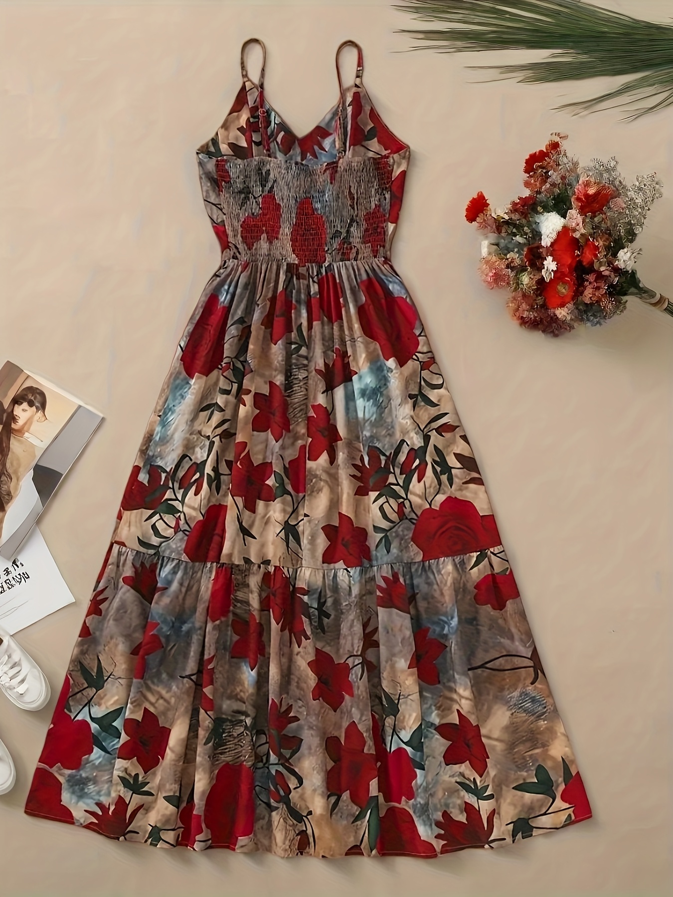 Women's Elegant Floral evening Dress - Formal Party, Wedding, Gala - Sleeveless A-Line Gown with Spaghetti Strap - Red Roses on Beige - Machine Washable Formal Attire, Wedding Guest Attire, Decorative Floral Print