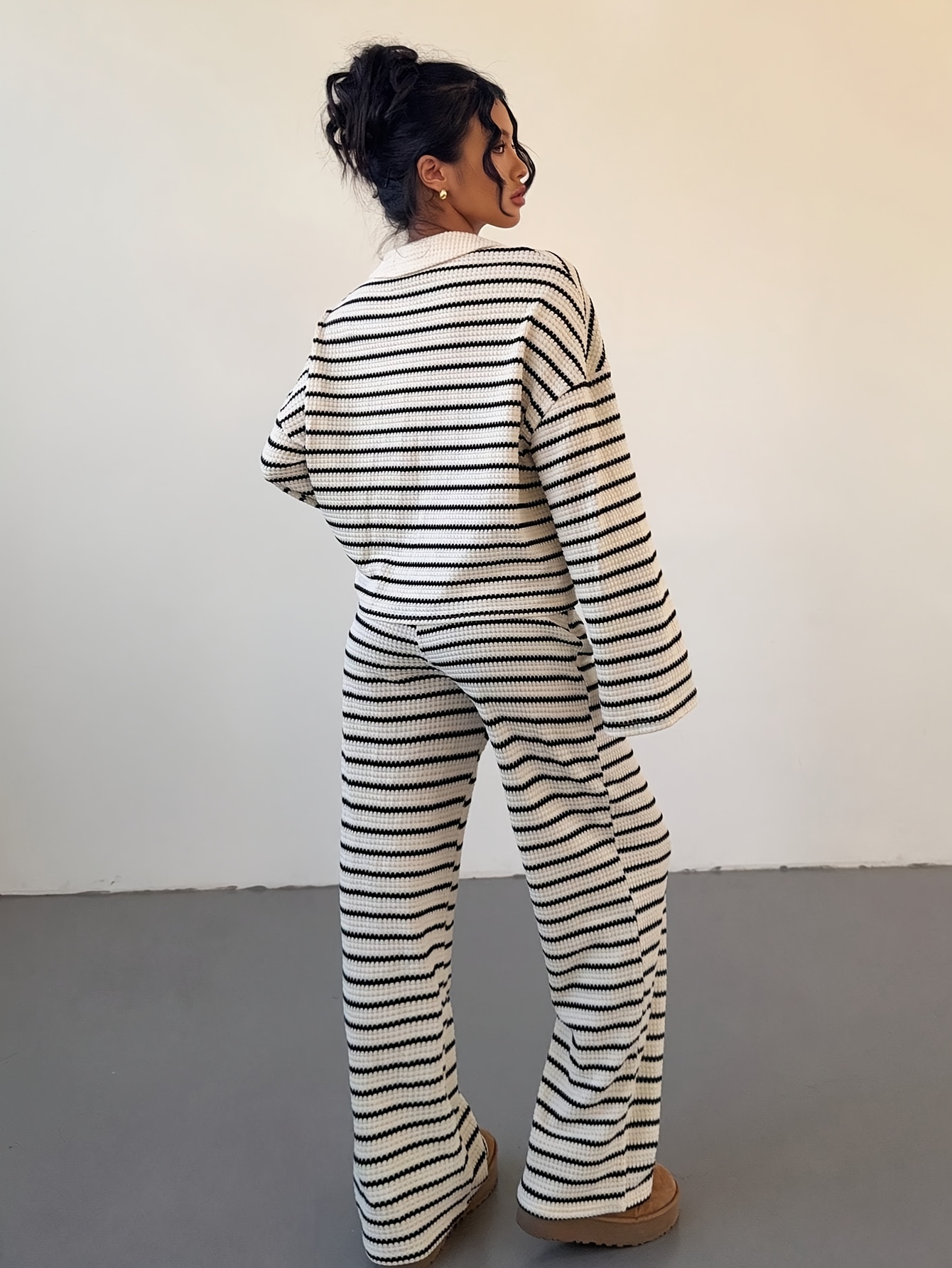 Women'S Spring/Autumn Two-Piece Set, Loose V-Neck and Drop Shoulder Long Sleeve T-Shirt with Elastic Striped Pants, Winter Pullover Outfit, Autumn and Winter Two-Piece Set