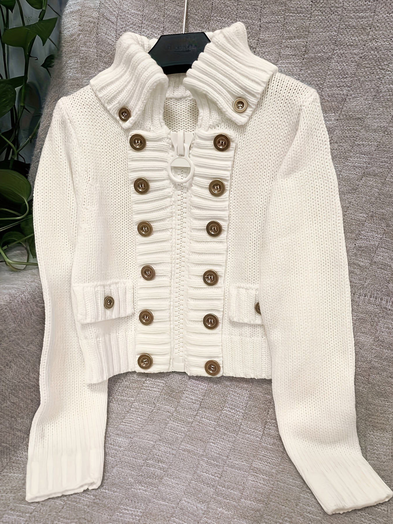 Women's Stand Collar Cardigan with Large Zipper and Button Design