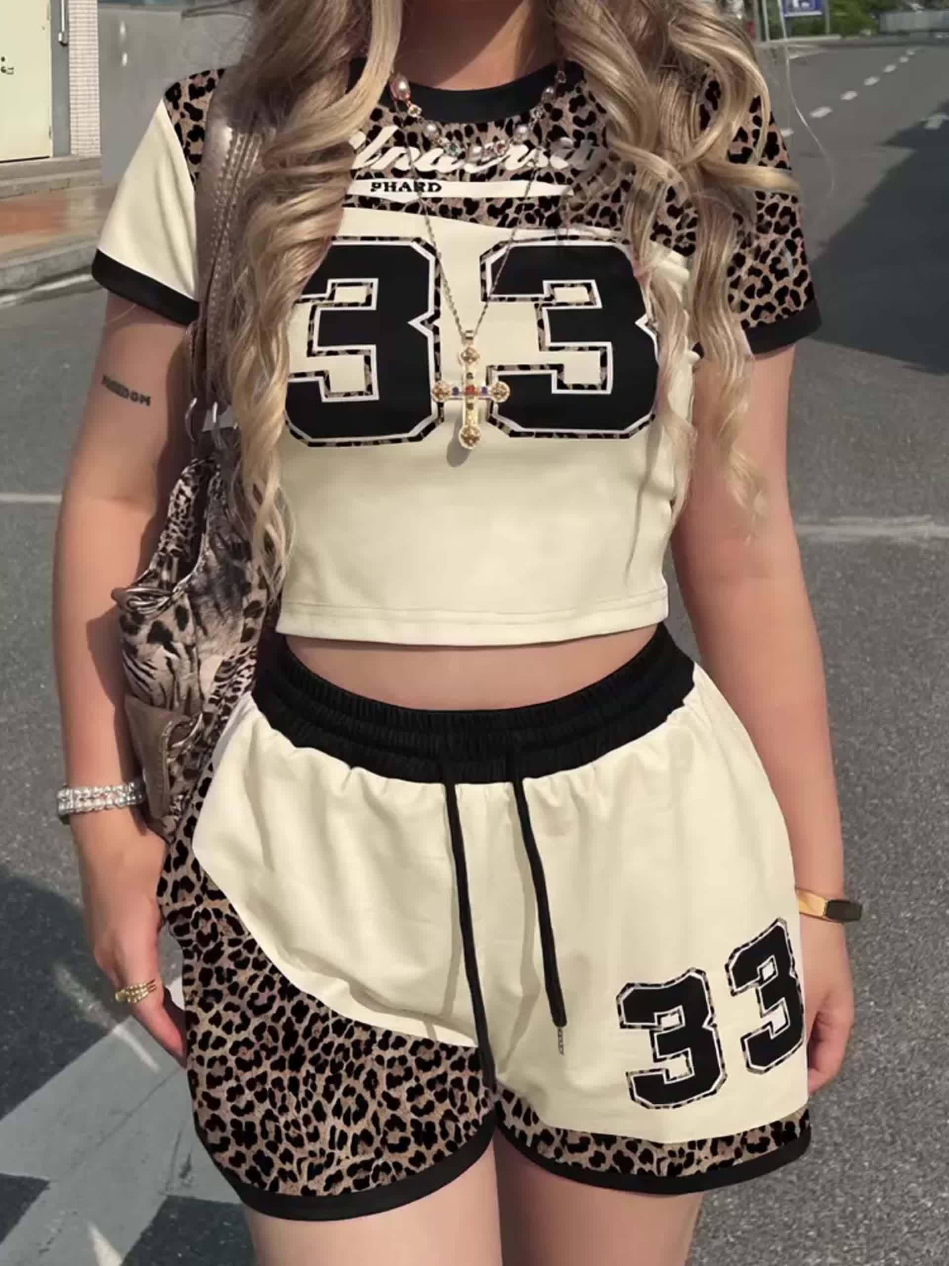 [2pcs Trendy Leopard Set] 2pcs Trendy Summer Leopard Print Short Sleeve + Shorts Set for Women | High-Waist Drawstring Pants and Digital Print, Versatile Outfit