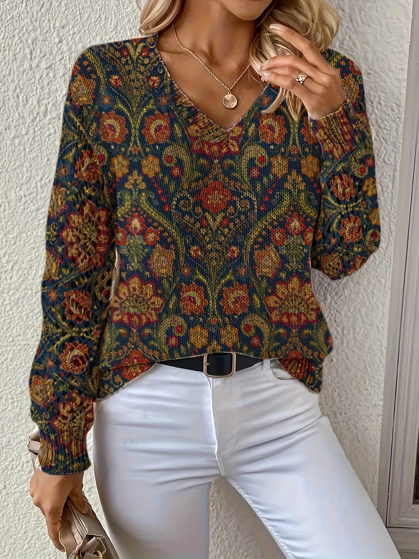 [Elegant Bohemian Sweater] Elegant Bohemian Women's V-Neck Long Sleeve Sweater | All-Season Floral Digital Print Pullover for Office, Streetwear & Home - Versatile Casual Chic Top