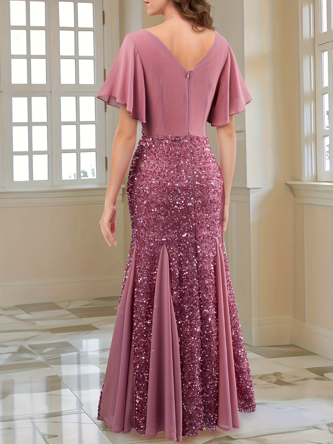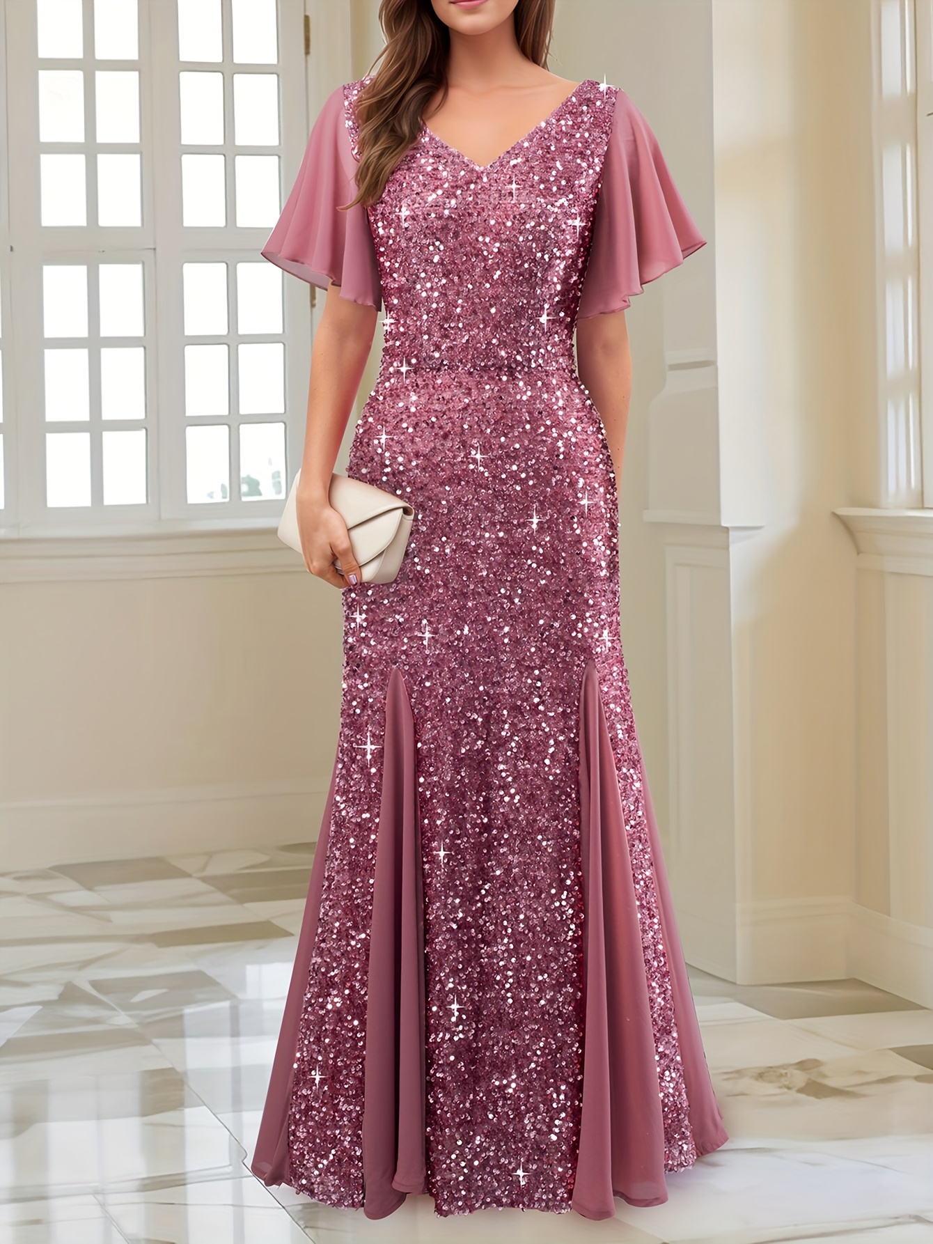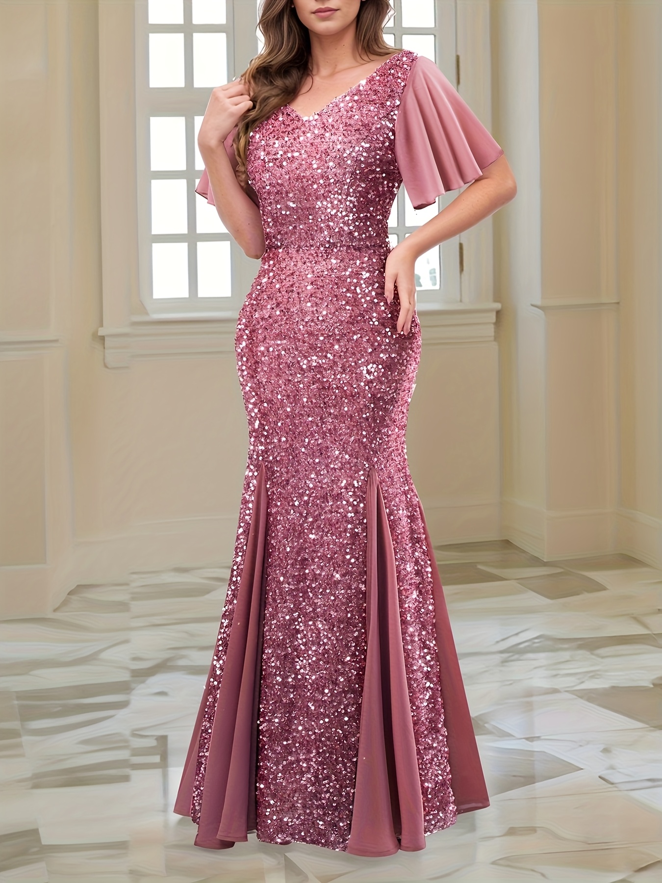 Elegant Pink Sequin Gown for Women - V-Neck, Short Sleeves, Flowing Skirt, Perfect for Parties and Formal Events, Formal Evening Wear | Vneck Gown | Sequin Embellishments, Dress