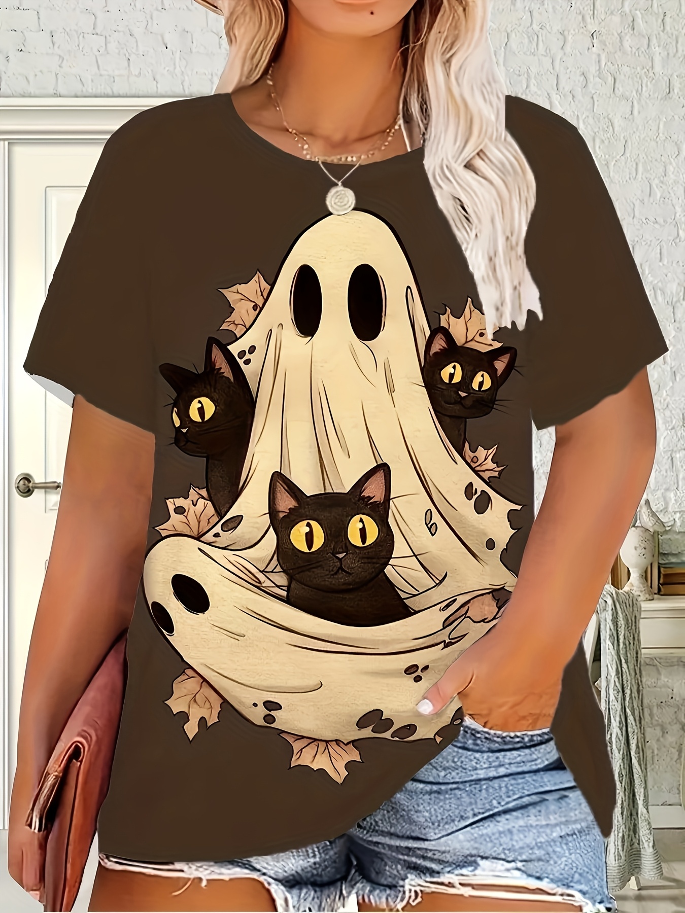 Plus Size - Plus Size - Women'S Plus Size Halloween T-Shirt - Cute Ghost & Pumpkin Print, Casual Crew Neck Short Sleeve Top, Medium Stretch, Non-Transparent, Machine Washable, Festive Summer Fashion, Halloween Apparel | Playful Print Top | Stretchy Fabric