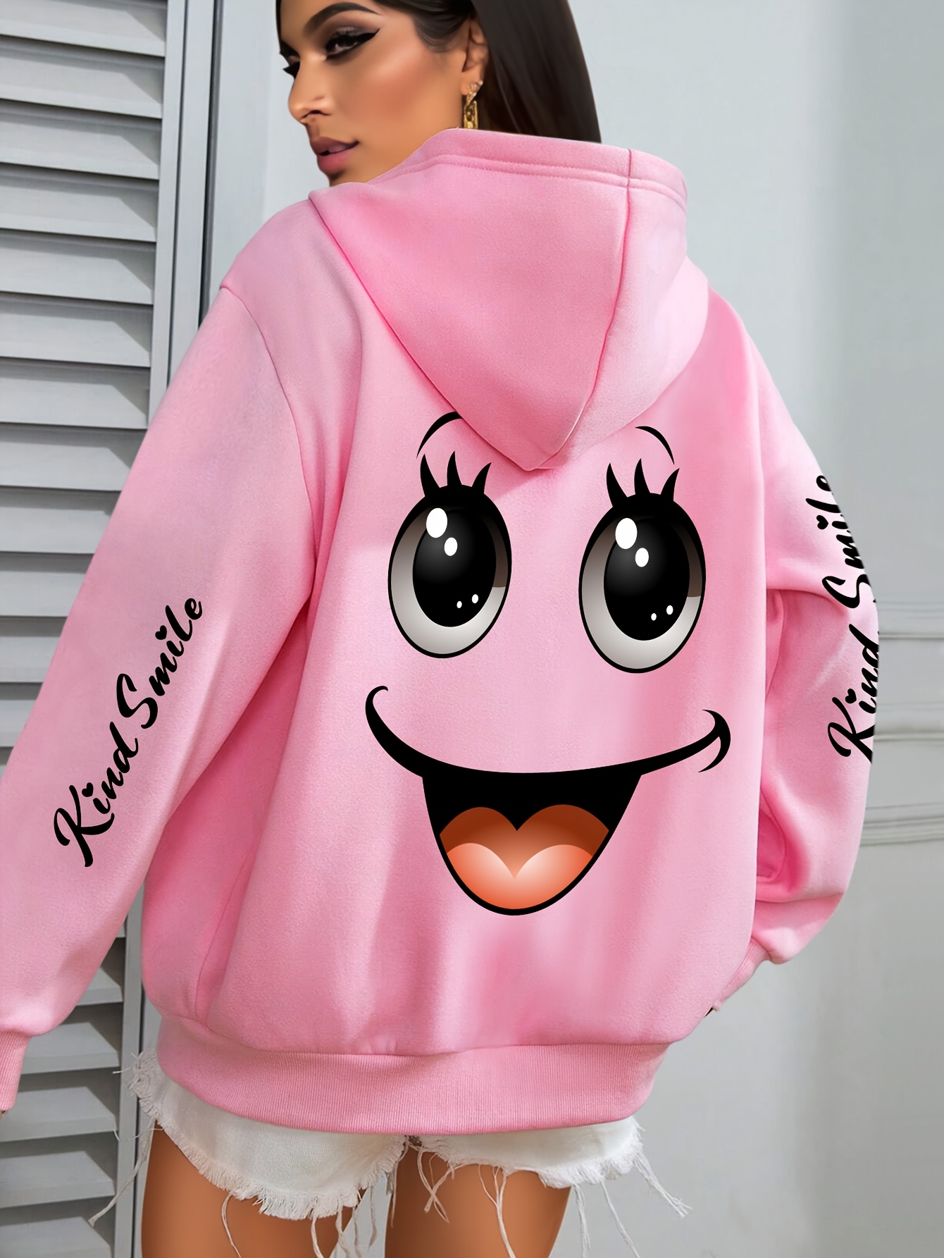 Plus Size smiling face Print Hoodie, Casual Fashion Sweatshirt, Hooded Pocket Drawstring Sweatshirt for Fall & Winter, Women's Clothing
