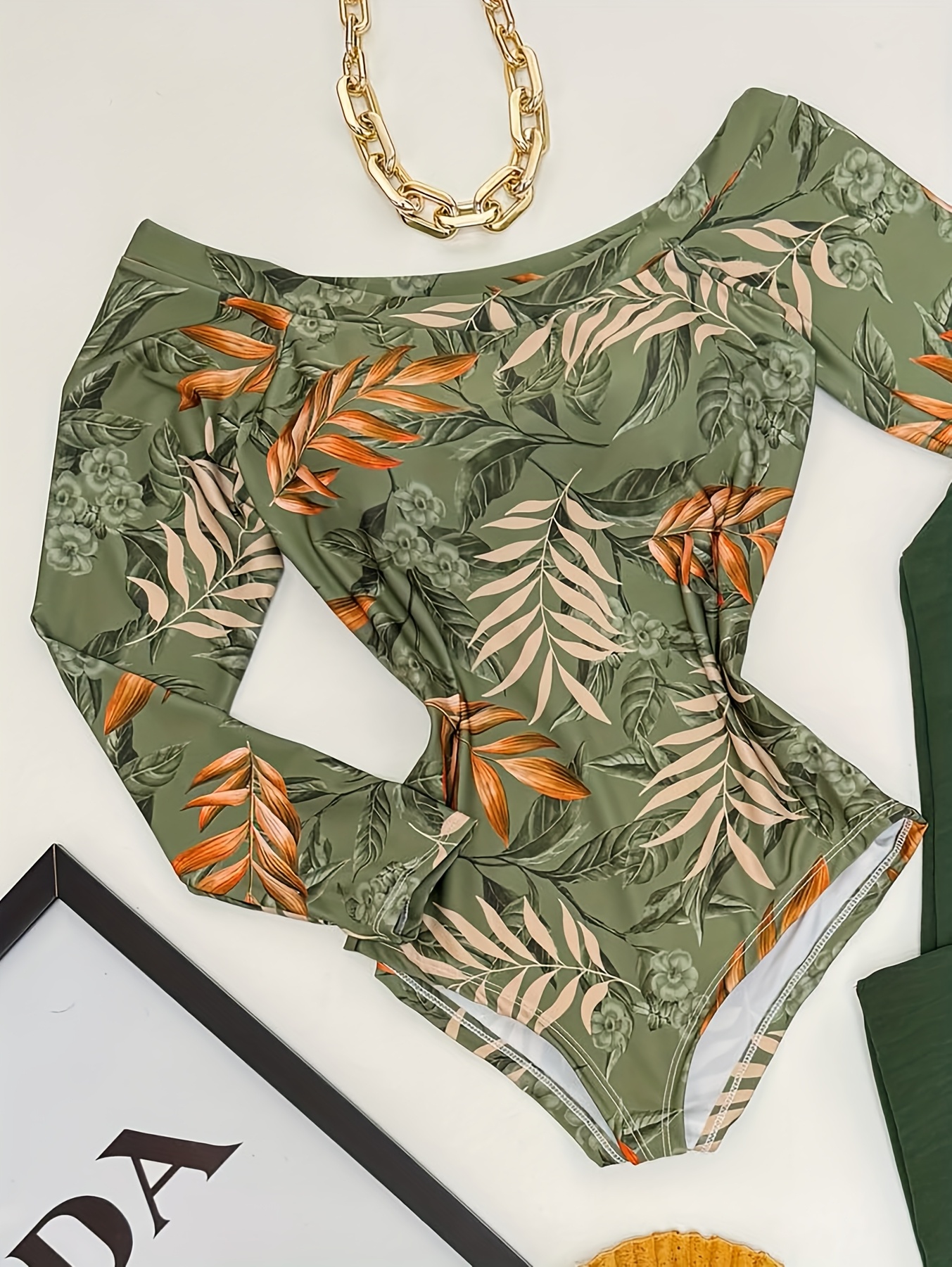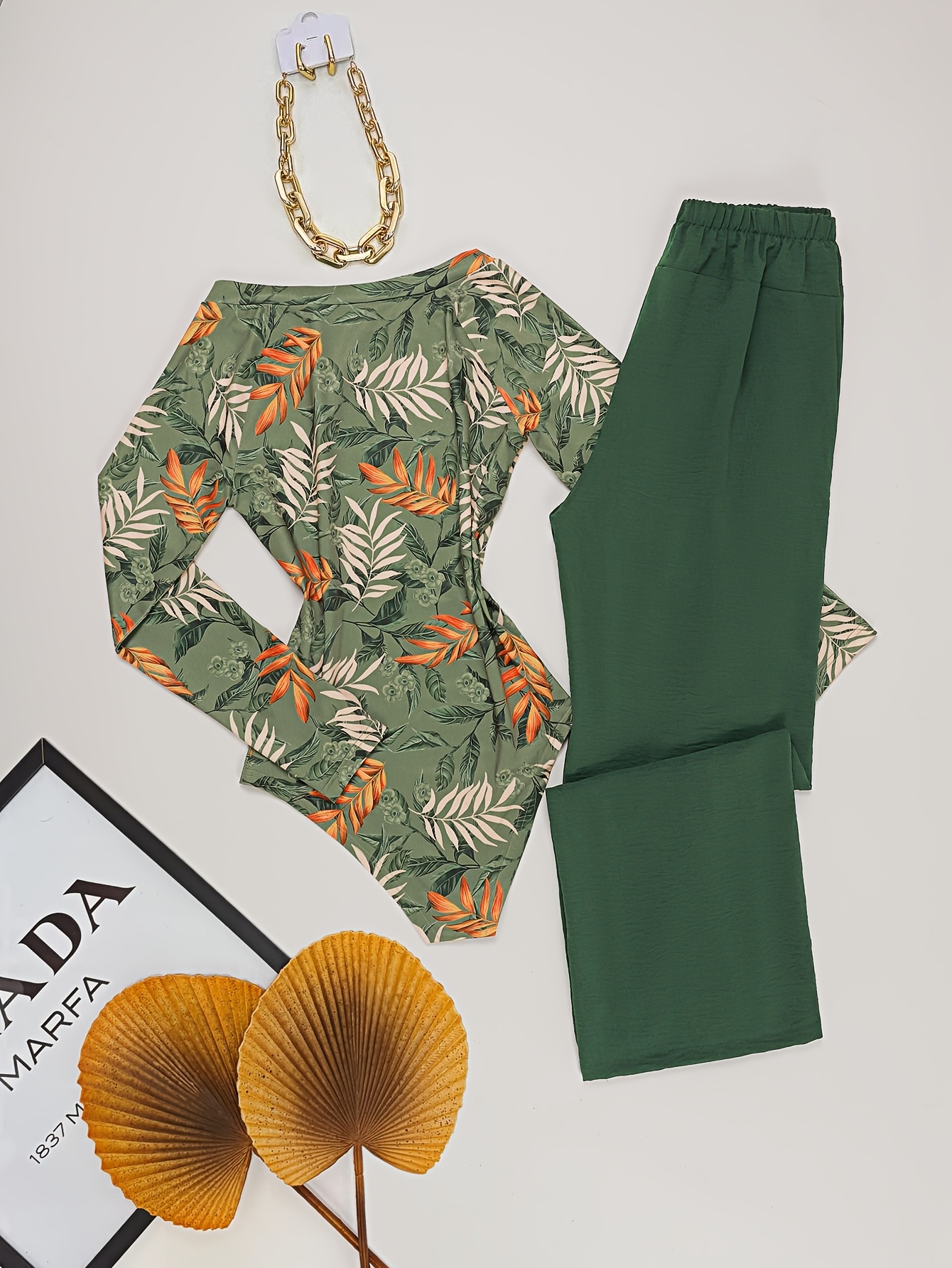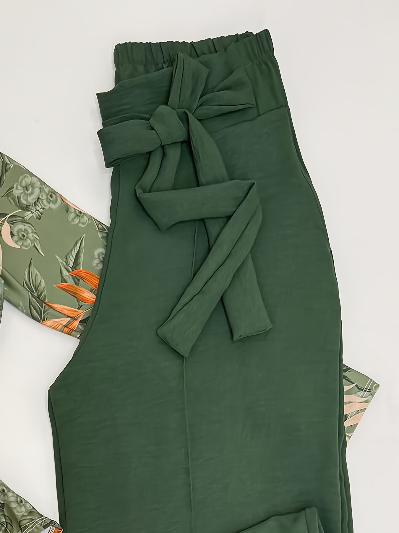 Summer, Off-Shoulder, Floral Print, Bow Tie, Green Summer Pants Set No Other Accessories