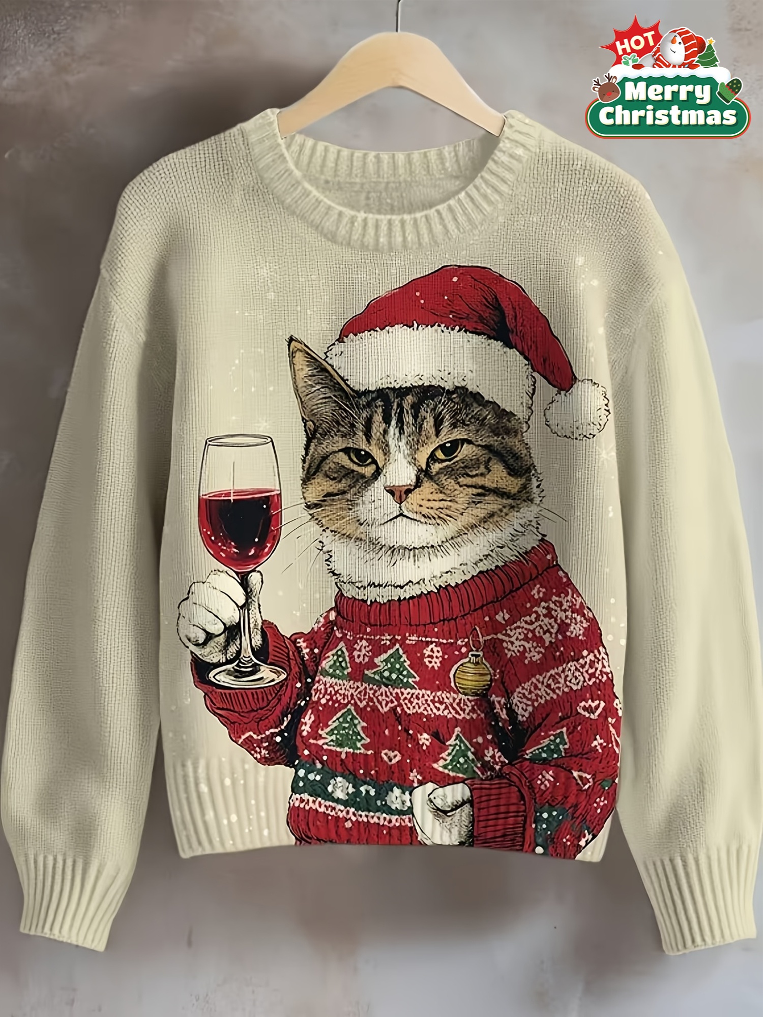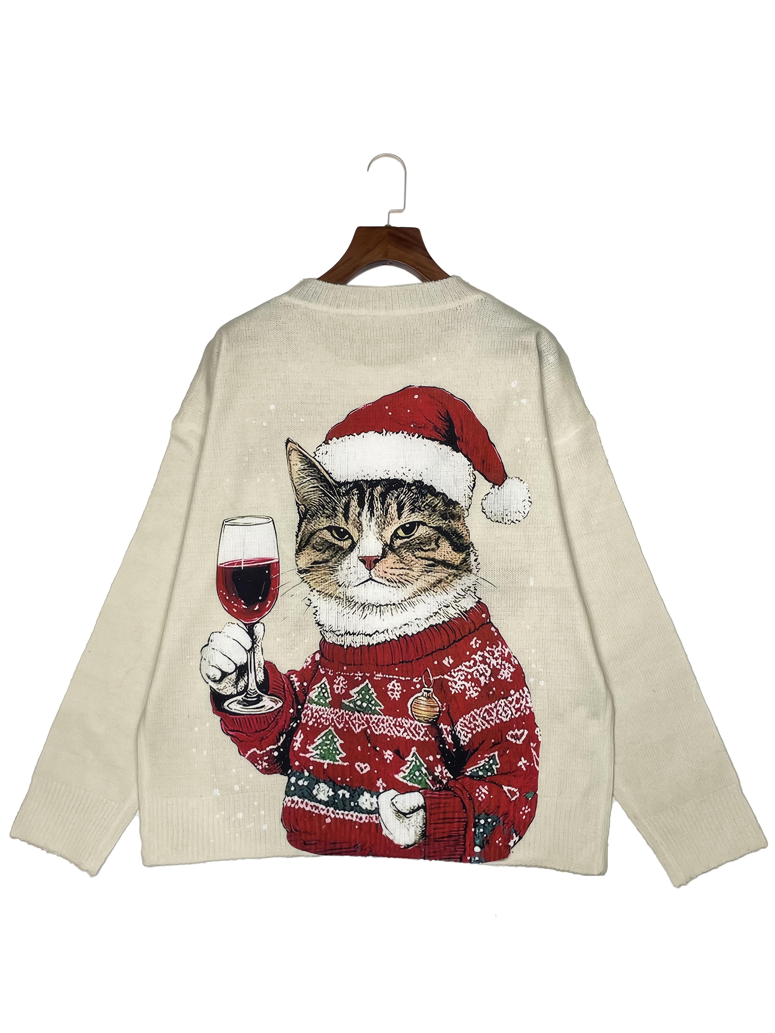 Women'S 3D Printed Cat & Wine Glass Sweater - Cozy Crew Neck, Long Sleeve, Festive Holiday Design with Santa Hat & Christmas Tree, Perfect for Fall & Winter, Holiday Sweater | Festive Cat Design | Construction, Cat Sweater