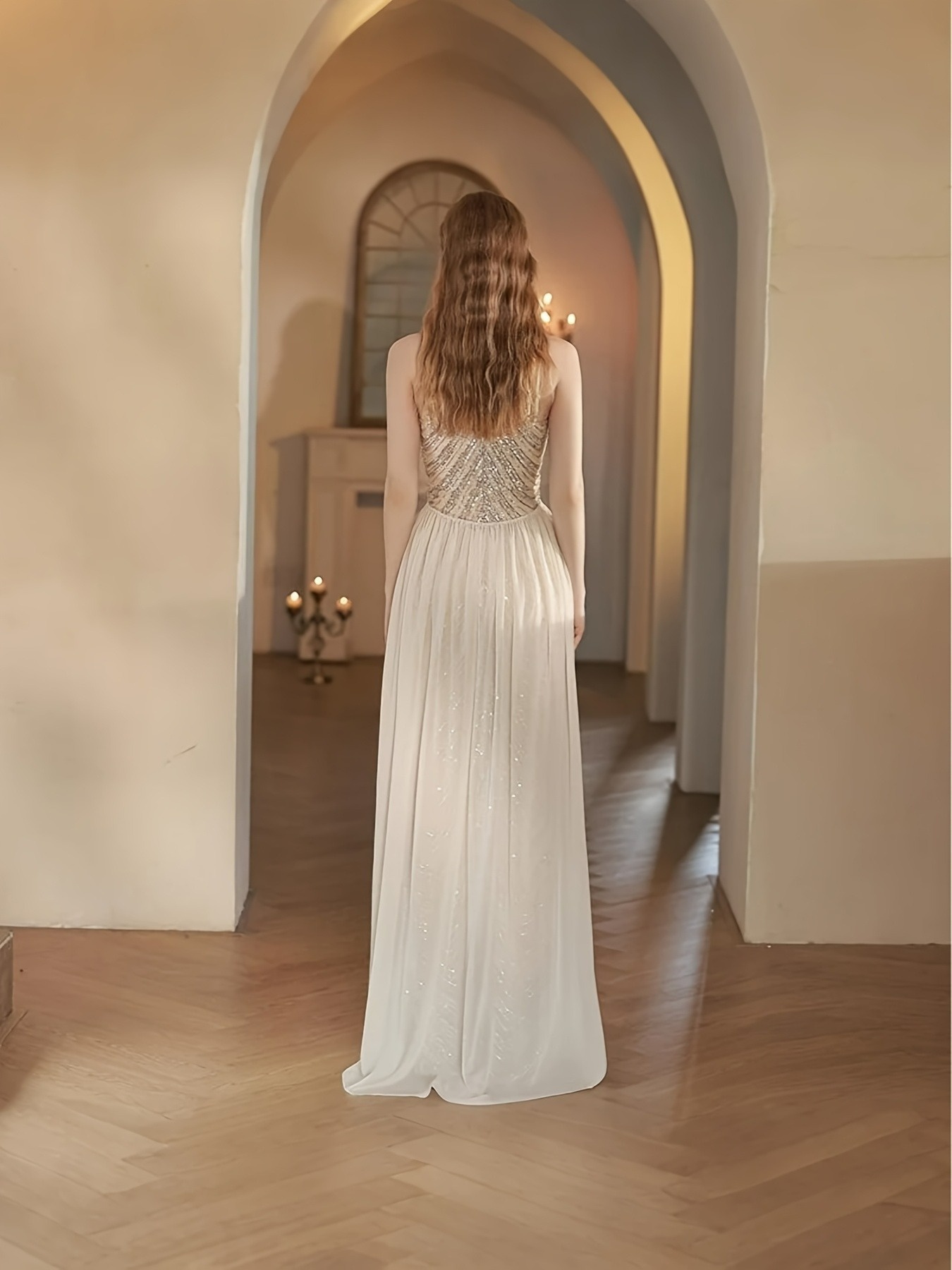 Women's Elegant Champagne Evening Gown - Formal Party Wedding Dress with Sequin Skirt, Mermaid-like Fishtail Train, for Prom, Galas, Hosting Events - Luxury Glamour Dress