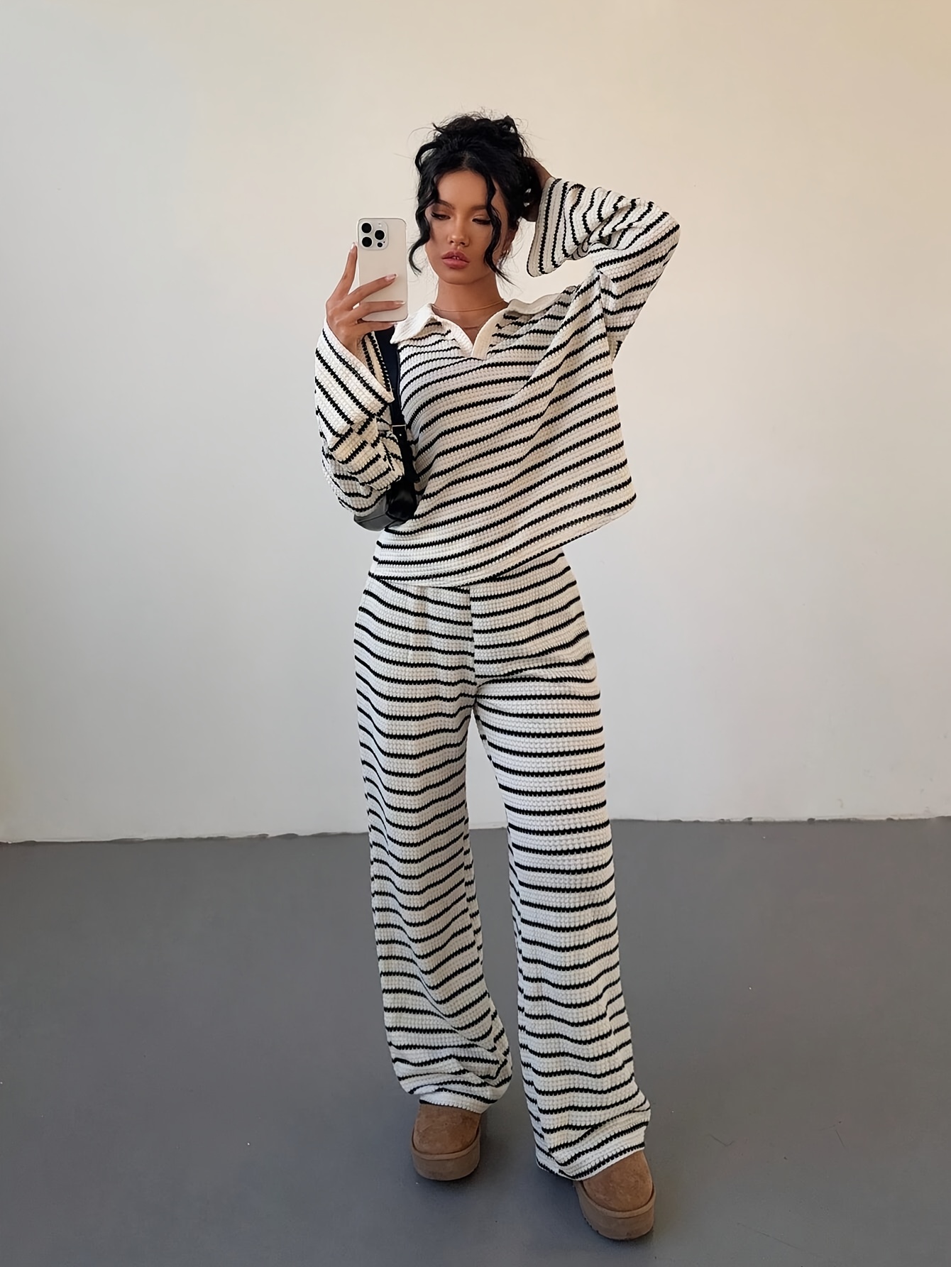 Women'S Spring/Autumn Two-Piece Set, Loose V-Neck and Drop Shoulder Long Sleeve T-Shirt with Elastic Striped Pants, Winter Pullover Outfit, Autumn and Winter Two-Piece Set